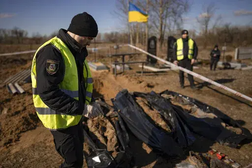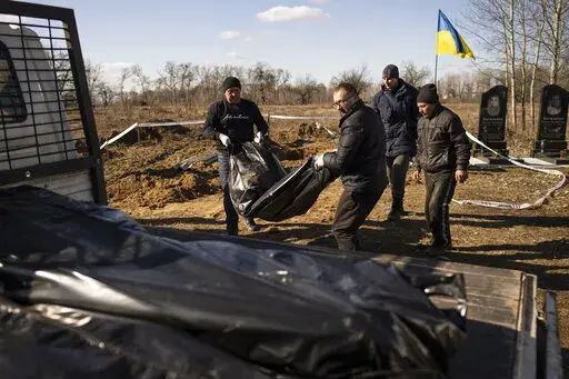 BORODYANKA, Ukraine (AP) — The freshly exhumed remains of three men lie in black body bags on the edge of the small cemetery in a town not far from Ukraine's capital, waiting to be taken to a morgue. None has yet been identified.